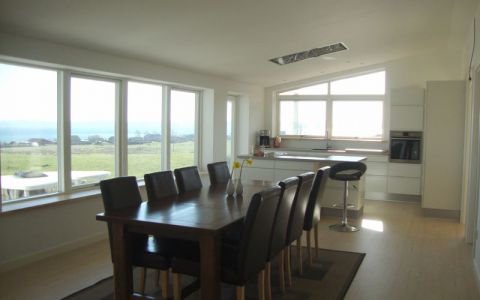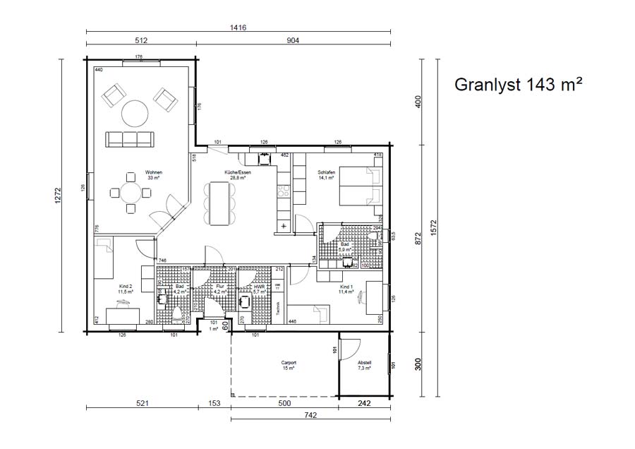In diesem Beispiel bietet das funktionell eingerichtete Winkelhaus mit zurückgesetztem Eingangsbereich und praktischem Windfang ausreichend Platz für die Familie mit bis zu 2 Kindern.