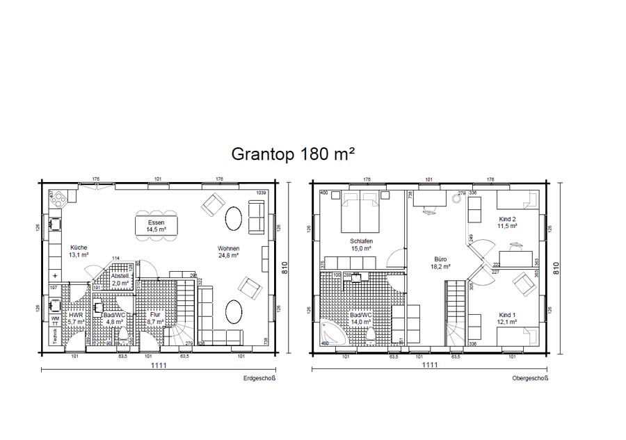 Auf zwei vollen Geschossen bietet das Haus Grantop in diesem Beispiel sehr viel Raum für behagliches Wohnen und hat dabei noch mehr als ausreichend Reserven für weitere Räume. Individuelle Wünsche bei der Gestaltung können selbstverständlich jederzeit berücksichtigt werden.