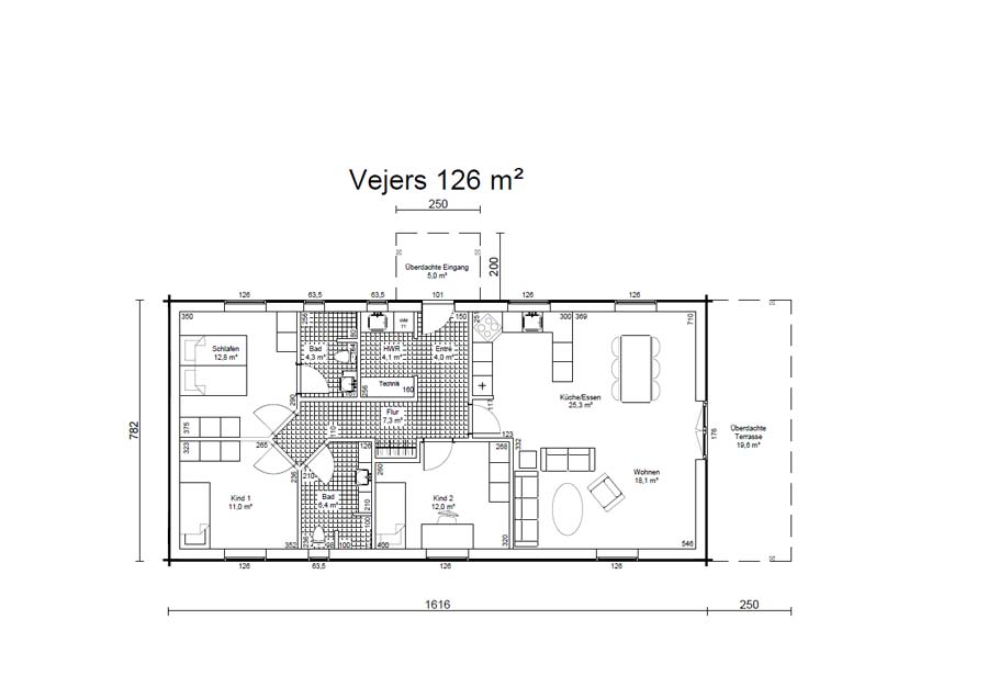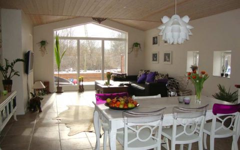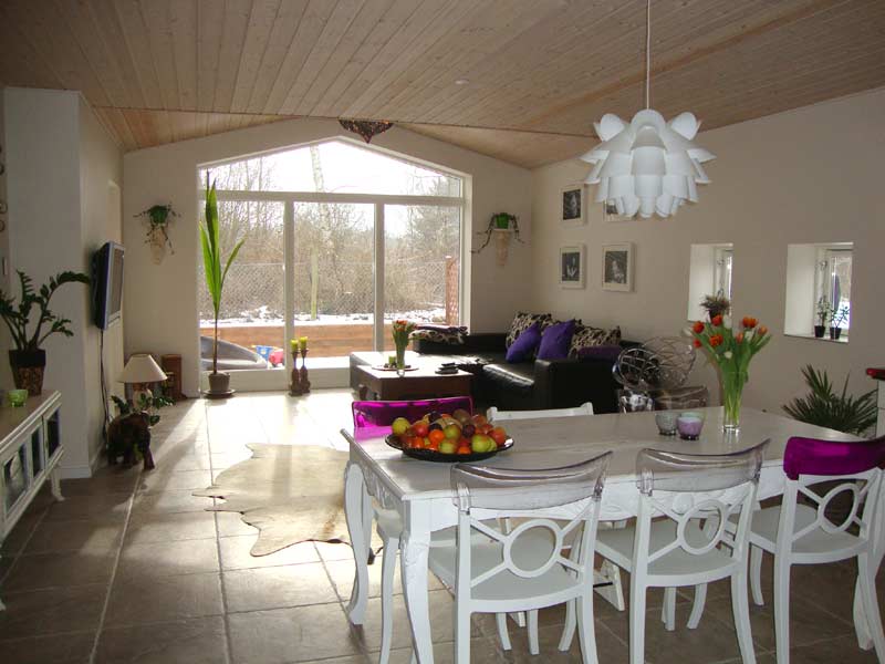 In diesem Beispiel bekommt der geräumige Wohn-, Küchen- und Essbereich durch die großen Fenster und die gleich dahinterliegende Terrasse einen sehr fröhlichen und freundlichen Eindruck und lädt förmlich zum Genießen ein.