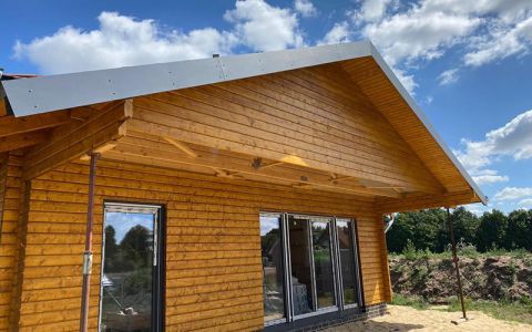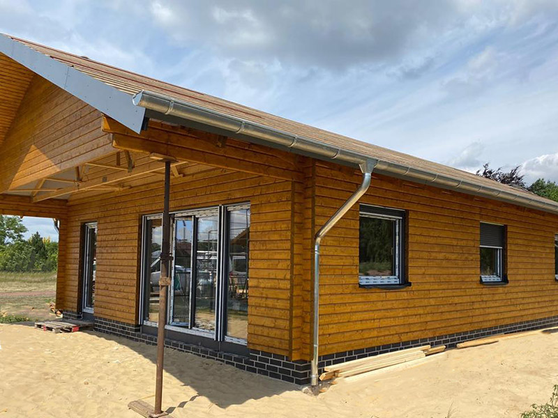 Im niedersächsischen Steyerberg bauten wir gerade ein schönes Blockbohlenhaus. Ein Einfamilienhaus von etwa 128 qm mit überdachter Terrasse. Die Blockbohlen haben nach der Montage auf Kundenwunsch eine Lasur bekommen. Die getönte Lasur schützt nicht nur das Holz. Sie bewahrt den natürlichen Charakter des Holzes und bringt die Maserung des Holzes zur Geltung. Im Gegensatz zu einen Farbanstrich, wittert eine Lasur jedoch schneller ab und muss regelmäßig neu auftragen werden, um das Holz optimal zu schützen.