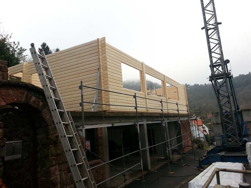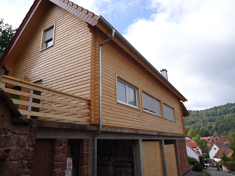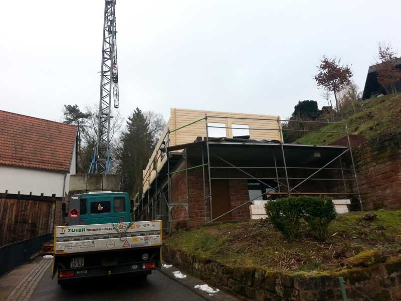 In Wiekersheim-Neubronn wird ein 1½-geschossiges Holzhaus mit Winkel gebaut