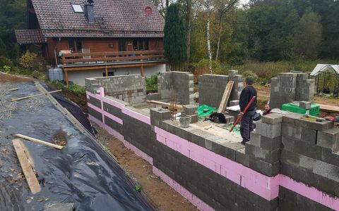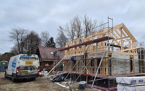 Die Foto-Story zeigt Eindrücke der einzelnen Bauphasen des Projektes – von den Kellerarbeiten über die Montage des Holzskelets bis hin zur Verkleidung der Wände.