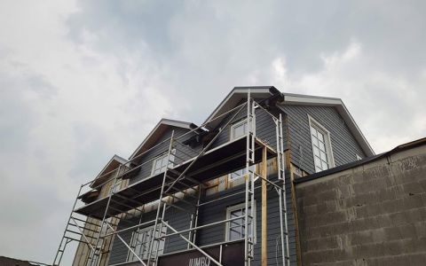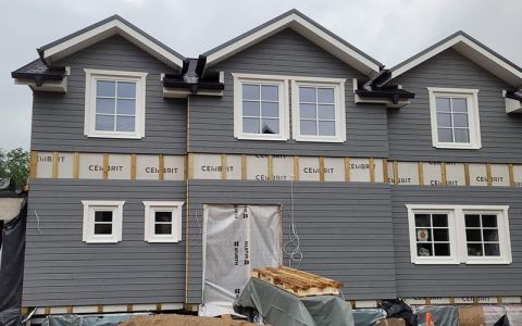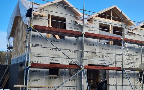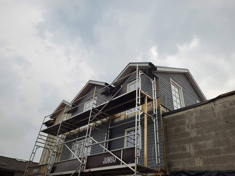 Die Verkleidungsbretter bestehen aus schiffsgetrockneten Qualitätsfichtenholz aus Schweden. Die komplette Verkleidung wurde in der Wunschfarbe des Kunden – in diesem Fall ein schönes Grau – bereits grundiert und lackiert geliefert. Nach Montage der Holzverkleidung empfehlen wir für zusätzlichen Schutz einen zweiten Farbanstrich, bevor das Gerüst endgültig abgebaut wird.