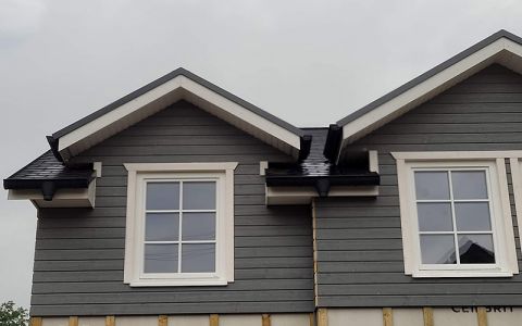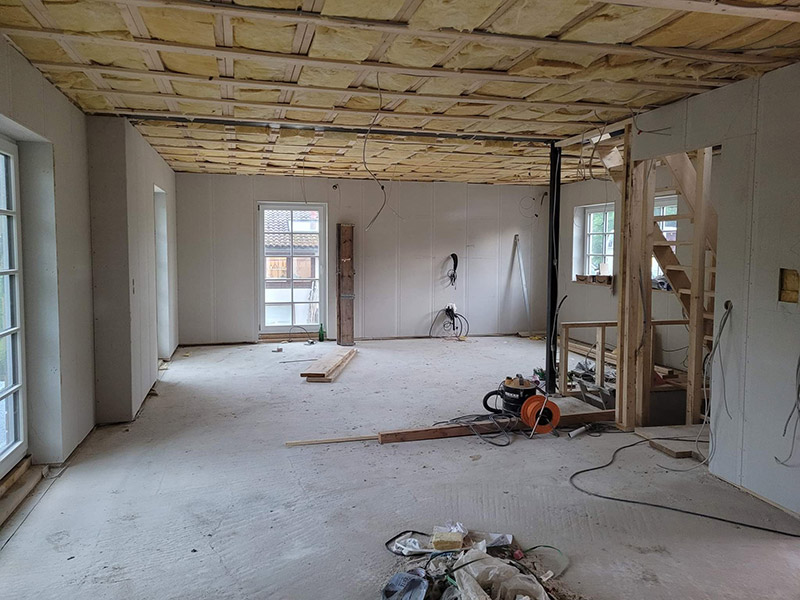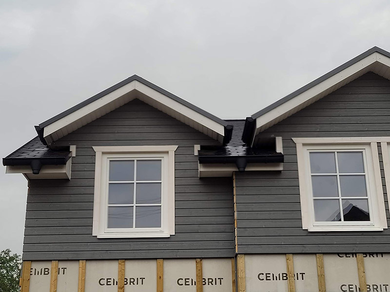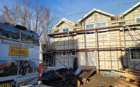 Das Haus ist mit sechs unterschiedlich großen Gauben versehen. Das Holzskelet wurde in unserer Fabrik in Aabenraa montagefertig zugeschnitten, damit es vor Ort schnell und problemlos aufgebaut werden konnte.