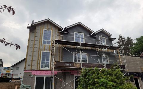 Bei Köln entsteht nun ein modernes 2-geschossiges Traumhaus als Holzrahmenbau. Das Haus mit 82 m2 pro Stockwerk bekommt anschließend einen 47 m2 großen Porch sowie einen Balkon.